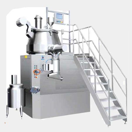 The machine is widely used in such industries as drug, food, dairy products, chemical industry, etc. It is a process machine widely applied during production, for example, the production of tablets, capsules, granules, and other wet granules. It has many functions such as mixing, granulating, etc. The materials are fed into the granulating pot through the vacuum feeder or lifting feeder. After the action of centrifugal force of mixing paddle, the pressure liquid supply system injects the adhesive through the spray gun. Meanwhile, the cutter rotates at a high speed. The materials are bonded into hollow granules in the pot and discharged to the next procedure (granule sizing or drying) after the granulating is nished